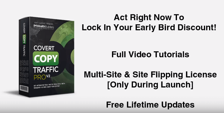 For a limited time, you can grab Covert Copy Traffic Pro V2 with an early bird discount price below