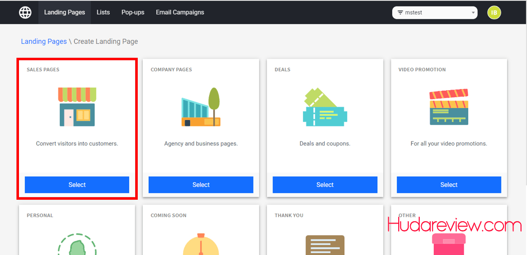 Step 2: Now on the screen, you will see the Landing Pages and types of pages you want to create.