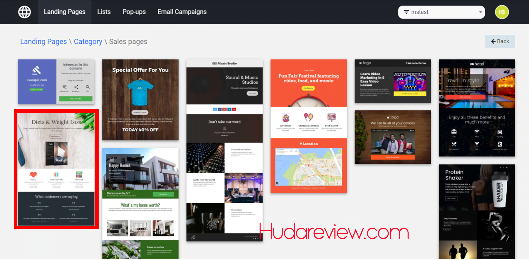 In this example, I will select Sales Pages. And these are the templates that is available to create a sales page. With each template, you can preview it in a larger size or select it straightaway. I will choose the one I marked red to work on.